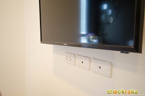 พื้นที่ตรงข้ามเตียงนอน มีปลั๊กเชื่อมต่อทั้งทีวี อินเทอร์เน็ต และโทรศัพท์ไว้ให้ครบ