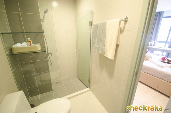 มีกระจกกั้นแยกส่วนเปียกส่วนแห้ง ชั้นวางของ ราวแขวนผ้าและฝักบัวอาบน้ำ