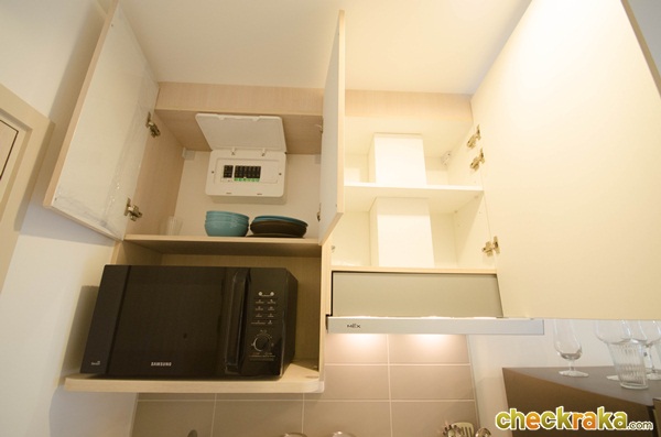 มีเครื่องดูดควันอยู่ติดกับชั้นวางของด้านบน