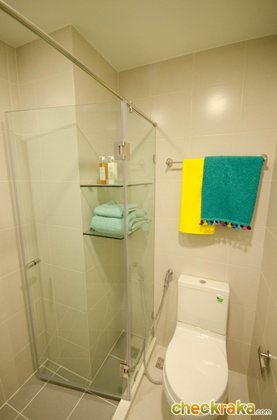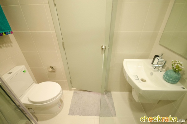 ทีวีอาจจะใช้แบบแขวนผนังเลยก็ได้นะคะ ห้องก็จะดูกว้างขึ้นอีกค่ะ ระเบียงด้านนอกมีที่แขวนคอมเพรซเซอร์แอร์ไว้ด้านบนค่ะ หันหน้าระบายความร้อนออกด้านนอกอาคาร ประตูบานเลื่อนกระจกเขียวตัดแสง เลื่อนได้ทั้ง 2 ด้าน มีตัวล็อก 2 ชั้น เพื่อกันลมกระแทกค่ะ ห้องน้ำปูพื้นและผนังด้วยกระเบื้อง ได้อ่างล้างหน้าและโถสุขภัณฑ์ของ cotto ด้านนี้มีชั้นวางของ ราวแขวนผ้า โถสุขภัณฑ์ สายฉีดชำระ ที่แขวนกระดาษชำระ และมีกระจกกั้นส่วนเปียกส่วนแห้งให้ค่ะ ภาพห้องตัวอย่างแบบที่ 2 จะพาชม ห้อง 1 bed ขนาด 30 ตร.ม. ค่ะ Lay out ห้อง 1 bed ขนาด 30 ตร.ว.