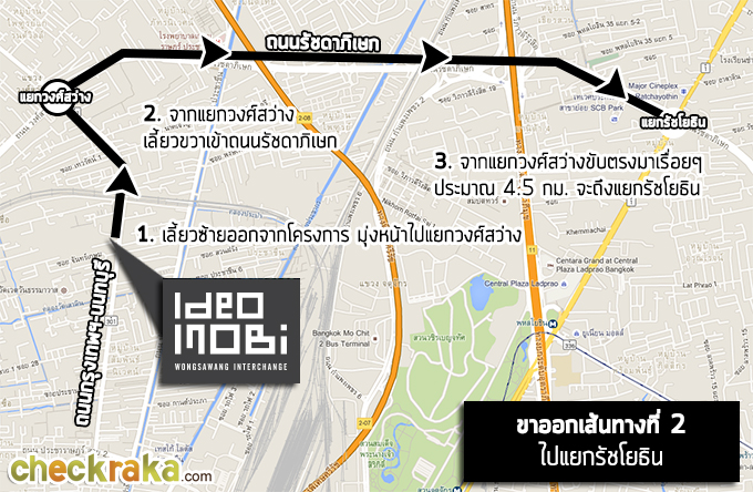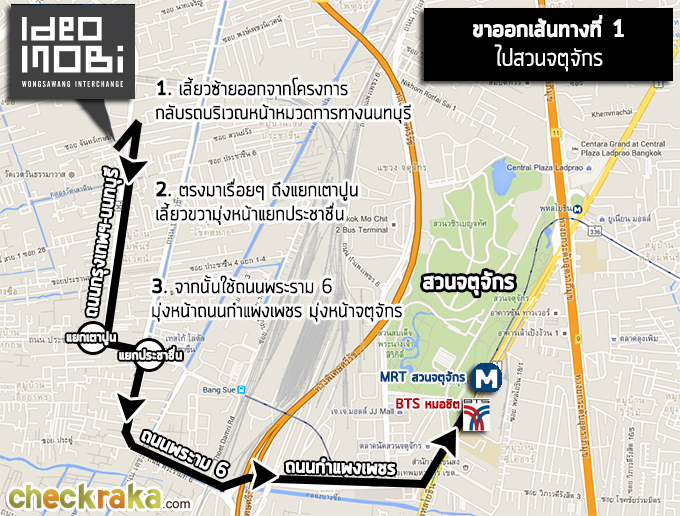 ขาเข้าโครงการเส้นทางที่ 2 - มาจากแยกแคราย ขาออกโครงการเส้นทางที่ 1 - ไปสวนจตุจักร ขาออกโครงการเส้นทางที่ 2 - ไปแยกรัชโยธิน 2. การเดินทางด้วยรถไฟฟ้า