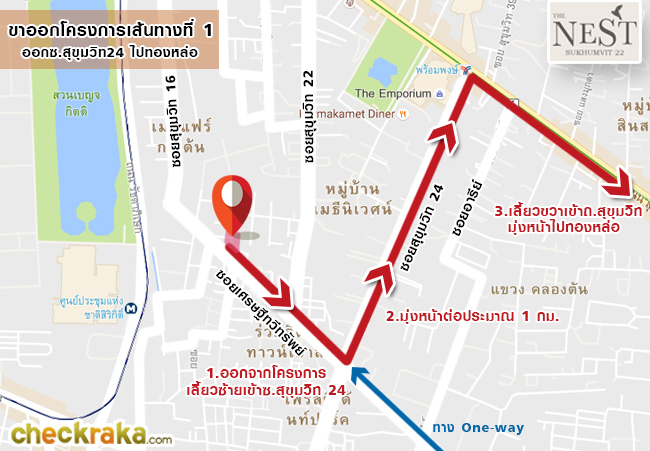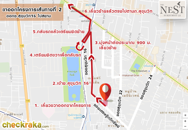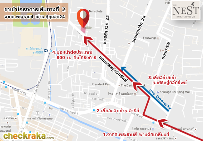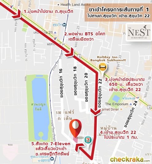 สังเกต 7-Eleven เลี้ยวขวาเข้าซอยเศรษฐีทวีทรัพย์ค่ะ เข้าซอยเศรษฐีทวีทรัพย์มาประมาณ 450 เมตร ก็ถึงโครงการแล้วค่ะ ขาเข้าโครงการเส้นทางที่ 2 แผนที่แสดงสถานที่ใกล้เคียงโครงการ The Nest Sukhumvit 22