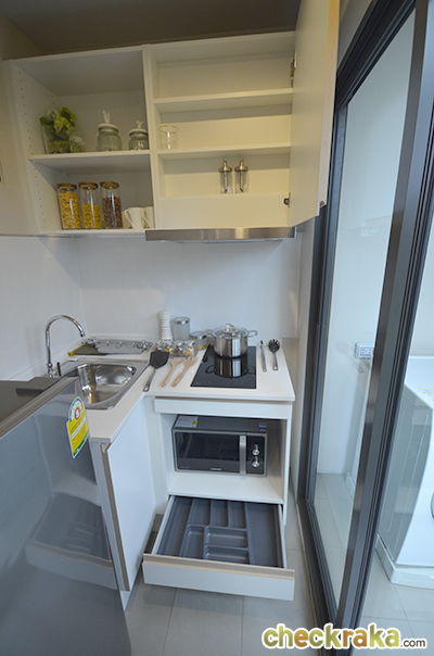 ออกมาจากห้องน้ำเดินผ่านโซนนั่งเล่นไปอีกฝั่งก็จะเป็นห้องครัว สำหรับโซนนี้จะมีหน้าต่างขนาดใหญ่อยู่ตรงกลางเลยค่ะ เป็นบานสไลด์และเป็นกระจกด้านล่าง