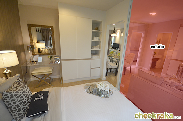 เข้ามาดูในห้องนอนกันบ้าง จริงๆ แล้วผนังกั้นห้องนอนจะเป็นผนังปูนปกติค่ะ ไม่ได้กั้นด้วยกระจก