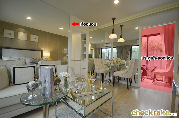 หน้ากว้างของห้องจะอยู่ที่ 7.5 เมตร จากพื้นถึงฝ้าสูง 2.45 เมตรค่ะ เข้ามาจะเจอ Living Area ก่อน และทางขวามือจะเป็นห้องนอน ย้ายเข้ามามองอีกฝั่งกันบ้าง ทางโครงการจัดโต๊ะรับประทานอาหารไว้ตรงใกล้ๆ ประตูทางเข้า-ออก