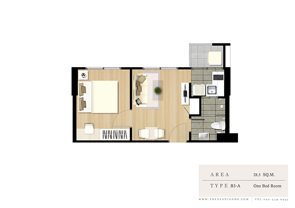 ภาพห้องตัวอย่างแบบ 1 ห้องนอน ขนาด 28.5 ตร.ม.