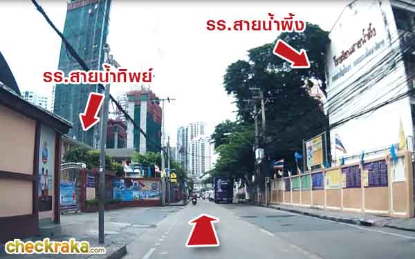 เข้ามาภายในซอยสุขุมวิท 22 จะเห็นโรงเรียนสายน้ำทิพย์อยู่ด้านซ้าย ตรงข้ามจะเป็นโรงเรียนสายน้ำผึ้งอยู่ด้านขวา