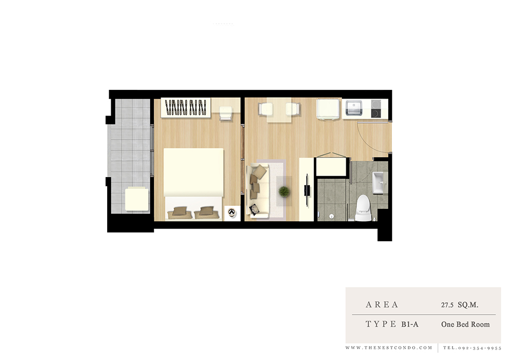 Layout ห้องแบบ 1 ห้องนอน ขนาด 28.5 ตร.ม. หน้ากว้าง 7.5 เมตรแบ่งส่วนเป็น 1 ห้องนอน