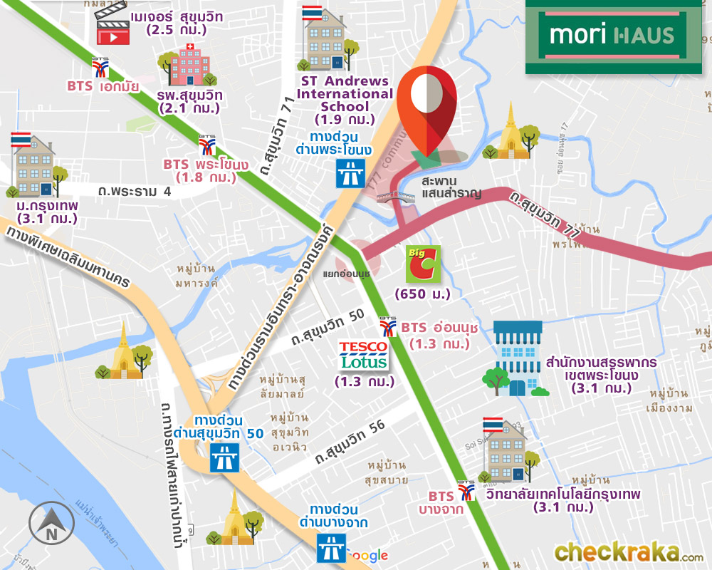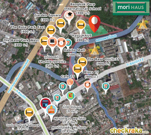 โครงการ mori HAUS ตั้งอยู่ติดถนนสุขุมวิท 77 ถือเป็นโครงการที่มีสิ่งอำนวยความสะดวกล้อมรอบจริงๆ ค่ะ เพราะตั้งอยู่ในพื้นที่ T77 Community มีคอนโดของแสนสิริอยู่รอบๆ อยู่ติดคลองพระโขนง มี Habito Mall อยู่ใกล้ๆ ระยะทางแค่ 500 เมตร ออกไปด้านนอกก็มีบิ๊กซี อ่อนนุช ถัดไปอีกหน่อยก็เป็น BTS อ่อนนุช (ระยะห่างประมาณ 1.3 กิโลเมตร) แต่ทางโครงการก็มีรถ Shuttle Service คอยรับส่ง ทั้งยังมีโรงเรียนนานาชาติ เรียกได้ว่าอยู่ตรงข้ามโครงการ mori HAUS เลยทีเดียว
