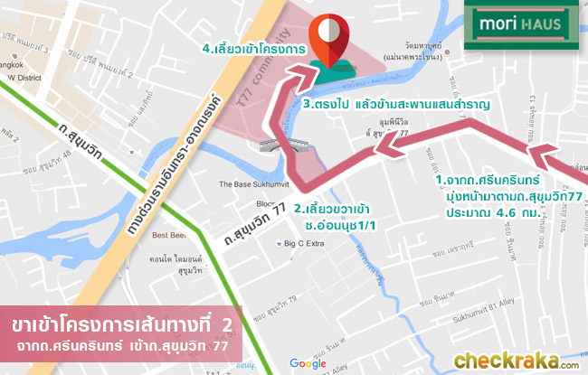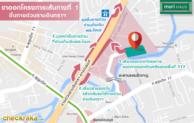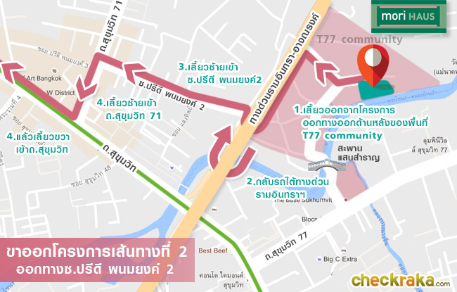 ขาเข้าโครงการเส้นทางที่ 2 จากถนนศรีนครินทร์ ไปตามเส้นทางถนนสุขุมวิท 77 ขาออกโครงการเส้นทางที่ 1 ออกทางออกด้านหลัง T77 Community ขึ้นทางด่วนรามอินทราฯ ขาออกโครงการเส้นทางที่ 2 ออกทางออกด้านหลัง T77 Community ลัดเข้าซอยปรีดี พนมยงค์ 2 2. การเดินทางด้วยรถไฟฟ้า BTS