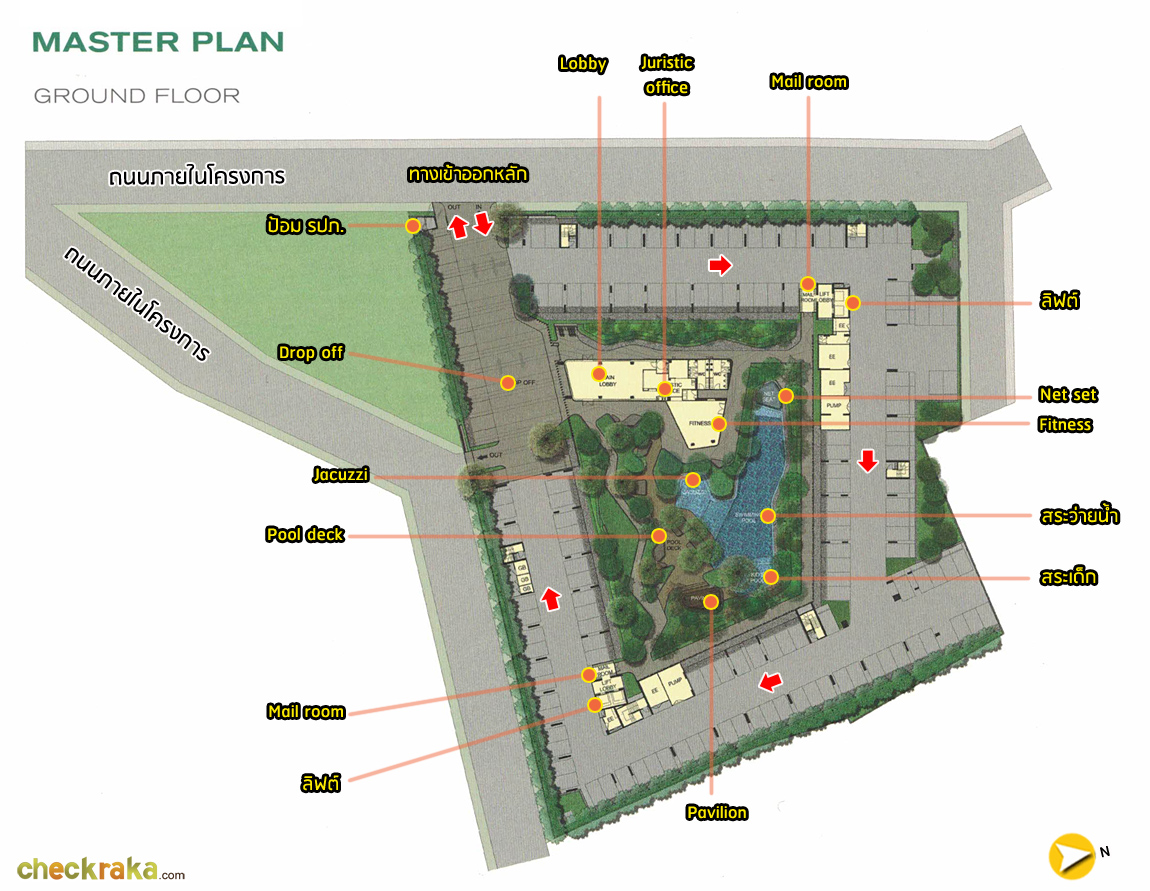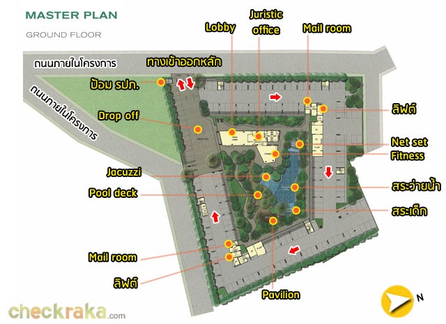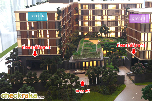 จากประตูทางเข้าขับตรงเข้ามาทางซ้ายมือจะเป็นทางเข้าที่จอดรถใต้อาคาร A ถัดมาจะเป็นจุด Drop off