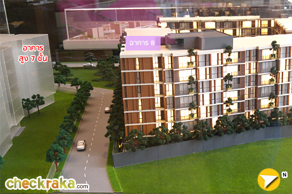 โมเดลโครงการมุมมองจากทิศตะวันตกฝั่งอาคาร A ติดกับถนนด้านหน้าโครงการ