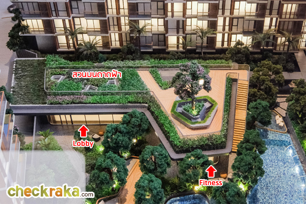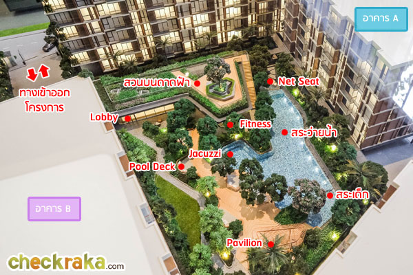 โมเดลโครงการมุมมองจากทิศเหนือฝั่งอาคาร A ติดกับพื้นที่วางวิวเปิดโล่ง
