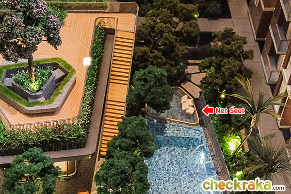 อีกส่วนที่น่าสนใจคือ สระว่ายน้ำระบบเกลือแบบ Freeform ซึ่งแบ่งออกด้วยกันเป็น 4 ฟังก์ชั่น ประกอบด้วย Lap Pool ความยาว 25 เมตร มีส่วนที่กว้างที่สุดอยู่ที่ 10 เมตร ความลึก 1.2 เมตร, สระเด็กความลึก 0.6 เมตร, Net Seat ตาข่ายเหนือน้ำ สำหรับให้พักผ่อนนอนชิลอยู่บนผิวน้ำ และจากุซซี่ ซึ่งถ้าเทียบขนาดสระว่ายน้ำ กับจำนวนยูนิตห้องพักของโครงการคอนโดที่ผ่านๆ มาของแสนสิริ ก็ถือว่าที่นี่ให้สระว่ายน้ำขนาดใหญ่ นอกจากนี้ แล้วทางโครงการยังจัดพื้นที่พักผ่อนสำหรับลูกบ้านไว้อีกหลายจุด อาทิ