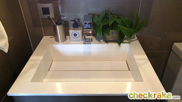 ผนังกรุด้วยกระจกเงาดำพร้อมชั้นวางจาน และไฟซ่อน อ่างล้างจานสแตนเลสทรงสี่เหลี่ยมแบบ 1 หลุมของ MEX แบบไม่มีที่พักจาน และก๊อกน้ำของ MEX ใต้อ่างล้างจาน เป็นตู้เก็บของเป็นบานสวิง ด้านขวาสุดเป็นแบบลิ้นชัก ดึงออกมาเป็นที่เก็บขยะ