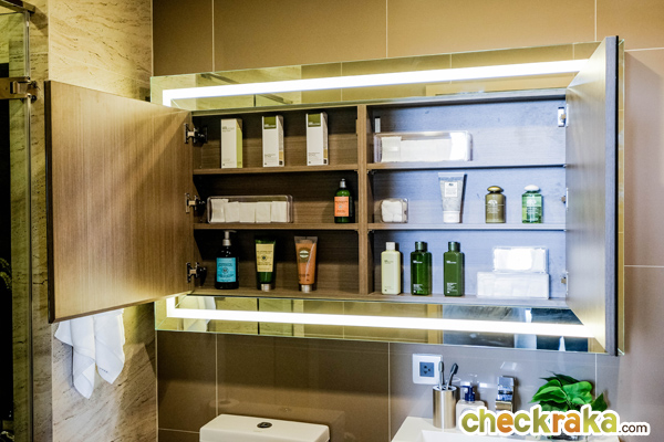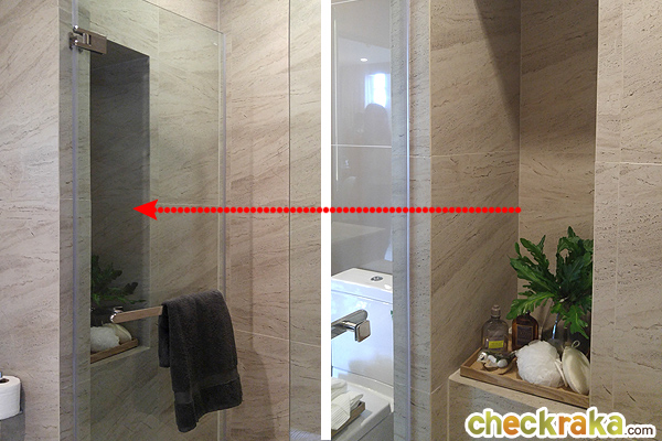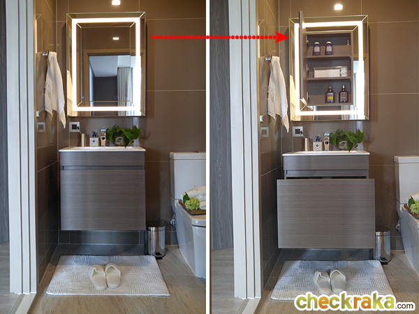 ห้องน้ำเด่นที่กระจกบานเต็ม และยาวกว่าห้องที่แล้ว เปิดออกมาเป็นชั้นวางได้เช่นกัน