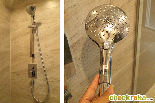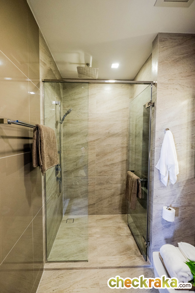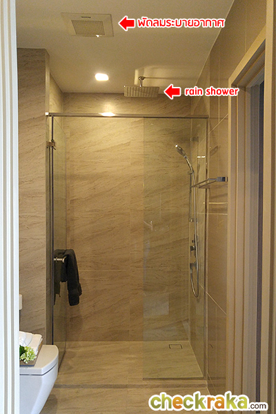 ธรณีกั้นความสูงประมาณ 3 ซม. บนเพดานติด Rain Shower และพัดลมระบายอากาศมากให้ด้วย ได้ฝักบัวแบบก้านแข็งอันใหญ่ หลังประตูเจาะเป็นช่องวางอุปกรณ์อาบน้ำ