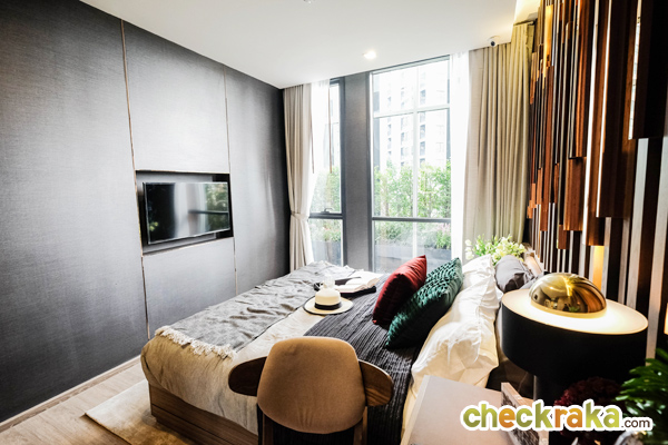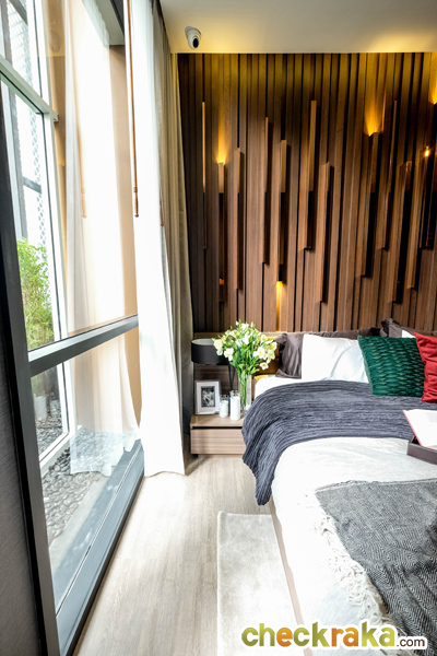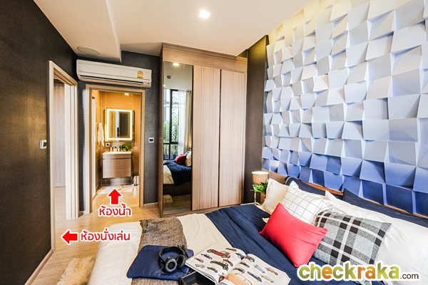 เข้ามาในห้องจะเจอเตียงวางอยู่ตรงกลาง สามารถวางเตียงขนาด 5 ฟุต ยังพอมีพื้นที่เหลือสำหรับเดินปลายเตียงอีกพอสมควร พื้นที่ข้างเตียงเหลือประมาณ 70 ซม.