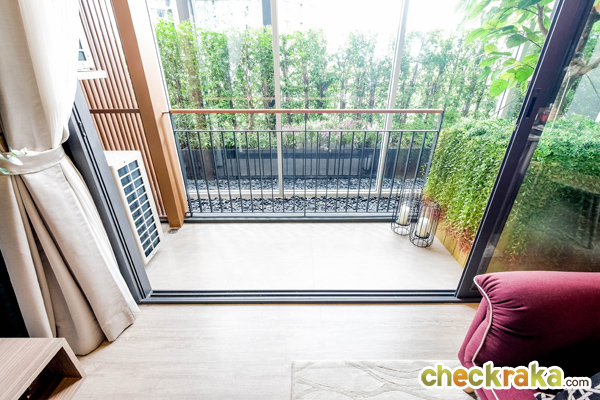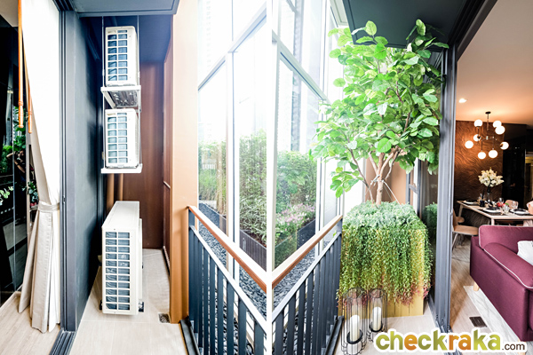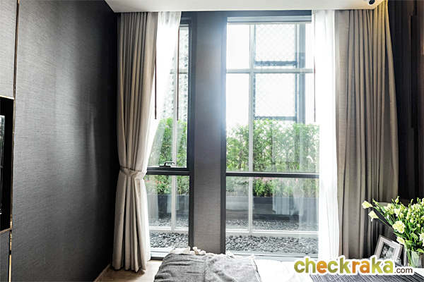 ซ่อนรางผ้าม่านเพิ่มความสวยงามและความเรียบร้อย ออกมานอกระเบียงทางด้านซ้ายจะเป็นที่วางคอมเพรสเซอร์แอร์ เป่าลมออกด้านนอกอาคาร มีกริลบังสายตามาให้