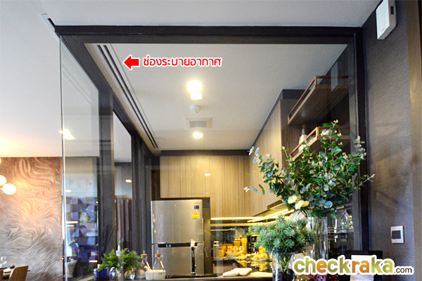 ในห้องครัวมีช่องระบายอากาศช่วยให้มีอากาศไหลเวียนได้ กระจกห้องครัวเป็นลามิเนต