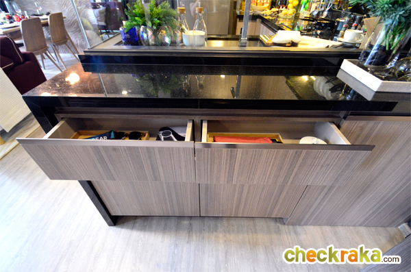 ใต้เคาน์เตอร์เป็นลิ้นชักสำหรับใส่อุปกรณ์ทำครัว พร้อมช่องเก็บช้อนแบบแนวตั้ง เพิ่มความสะดวกในการหยิบ