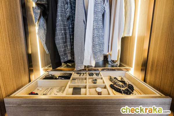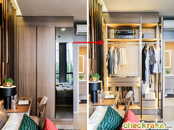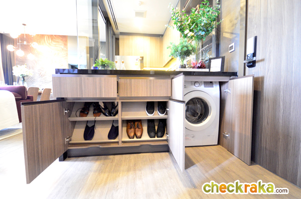 เปิดตู้ออกออกมาฝั่งซ้ายของตู้เป็นชั้นสำหรับเก็บของ และชั้นวางรองเท้า ส่วนทางฝั่งขวาทำไว้สำหรับใส่เครื่องซักผ้า