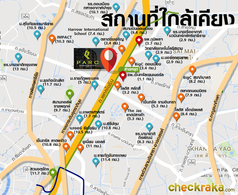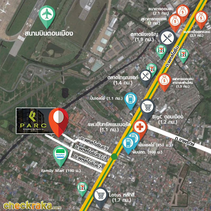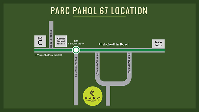 โครงการ PARC Residence @ Pahol 67 ตั้งอยู่ในซอยพหลโยธิน 67 เป็นทำเลที่อยู่ใกล้รถไฟฟ้าสายสีเขียว (กำลังก่อสร้าง) สถานีสายหยุด อยู่ใกล้สนามบินดอนเมือง ใกล้แหล่งของสดคาวหวานครบครันที่ตลาดยิ่งเจริญ ใกล้ Big C ใกล้โรงพยาบาล และมีโรงเรียนรวมถึงมหาวิทยาลัยกระจายตัวอยู่รอบๆ เรียกว่าไปทางไหนก็จะสะดวก