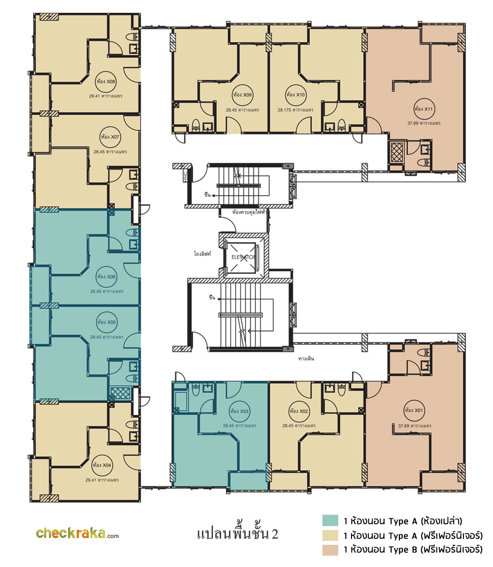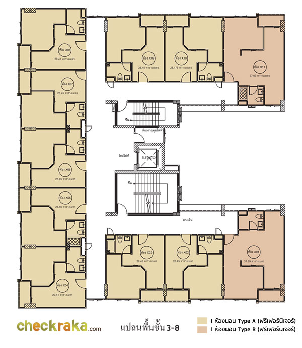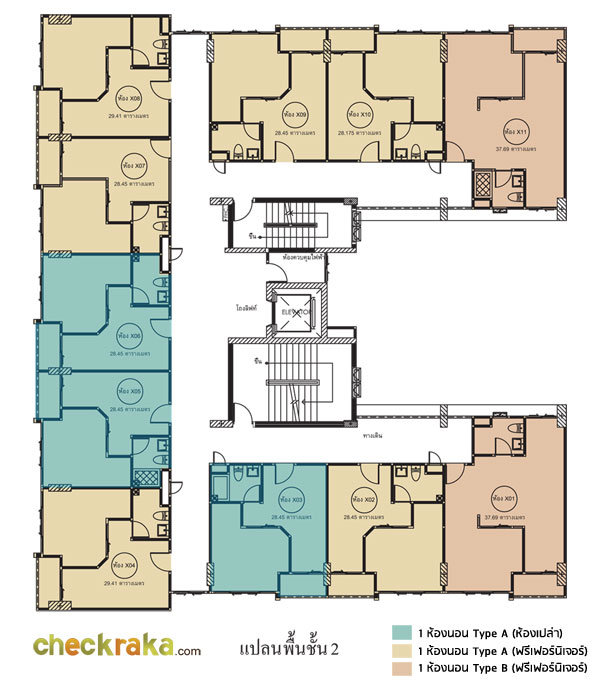 ยูนิตต่อชั้นอยู่ที่ 11 ยูนิต เป็นห้อง Type A ขนาด 28.45 ตร.ม. จำนวน 7 ยูนิต, ห้องขนาด 29.41 จำนวน 2 ยูนิต