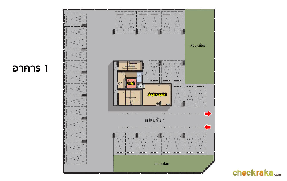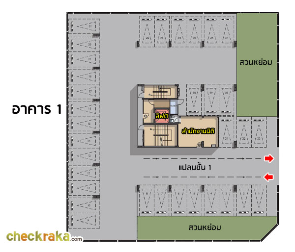 ชั้นที่ 1: สำนักงานนิติบุคคล, ห้องฟิตเนส, ตู้จดหมาย, พื้นที่จอดรถ, ลิฟต์โดยสาร 1 ตัว