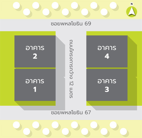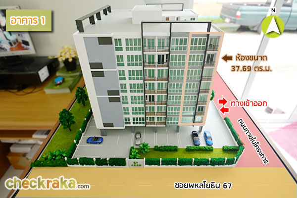 วิวอาคารฝั่งทิศใต้ : เป็นฝั่งด้านหน้าของโครงการ ตัวอาคาร 1 และอาคารคาร 3 จะติดกับซอยพหลโยธิน 67 และ