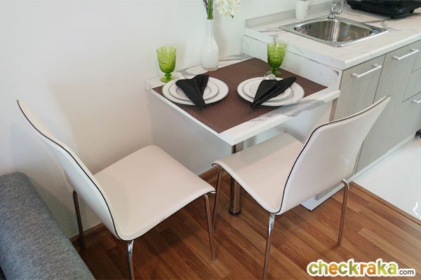 ติดกับโซฟาจะเป็นพื้นที่สำหรับทานอาหาร ทางโครงการจัดโต๊ะทานอาหารลายหินอ่อน พร้อมเก้าอี้สีขาวมาให้ 2 ตัว