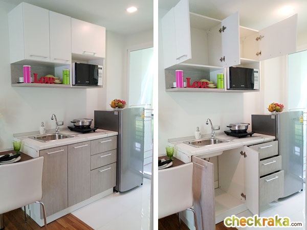 ด้ตู้เก็บของทั้งด้านล่าง และด้านบน ติดกันเป็นพื้นที่สำหรับวางตู้เย็น ที่เห็นในภาพเป็นตู้เย็นขนาด 6.9 คิว ซึ่งจะวางเป็นตู้เย็นขนาดใหญ่กว่านี้อีกหน่อยก็ได้เพราะยังเหลือพื้นที่ด้านข้างอีก พื้นห้องครัวปูด้วยกระเบื้องสีขาว ขนาด 60x60 ซม.
