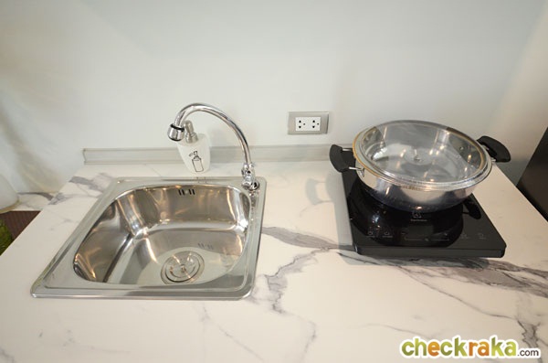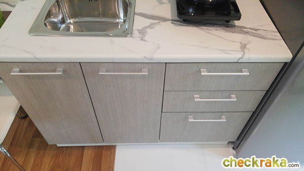 เคาน์เตอร์ครัวได้เป็นลายหินอ่อนเหมือนกันกับโต๊ะทานข้าว มือจับเป็นอลูมิเนียมสีเงิน