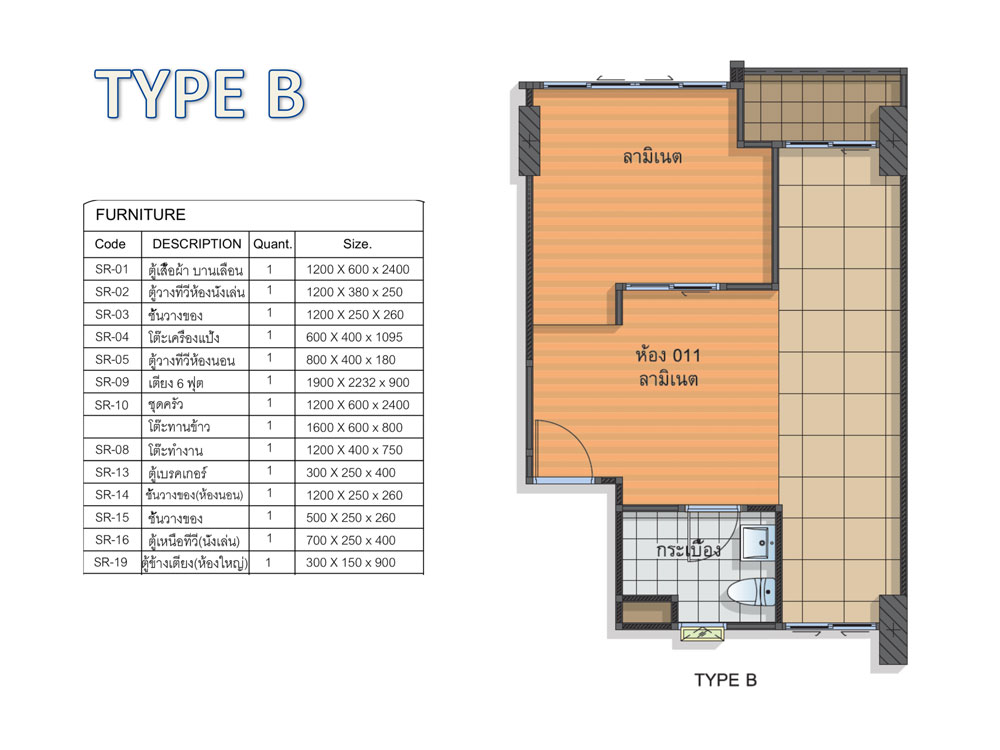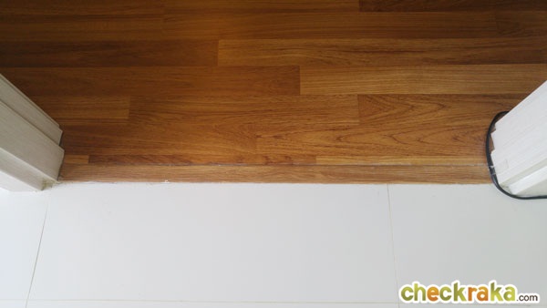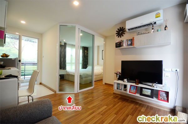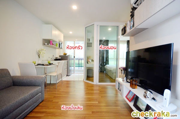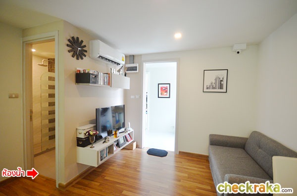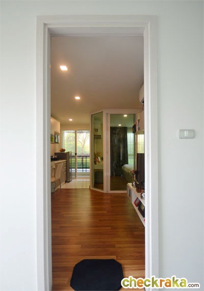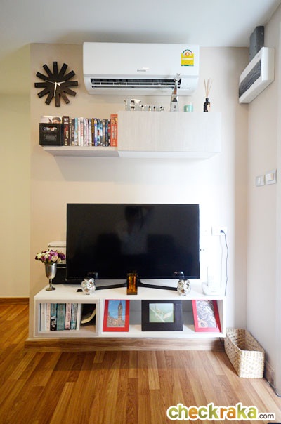 พื้นห้องก็ปูด้วยไม้ลามิเนต เข้ามาทางด้านขวามือจะเป็นชั้นวางทีวี พร้อมที่ชั้นวางของ และตู้ลอยติดผนังด้านบน บานพับเป็นแบบ Soft close