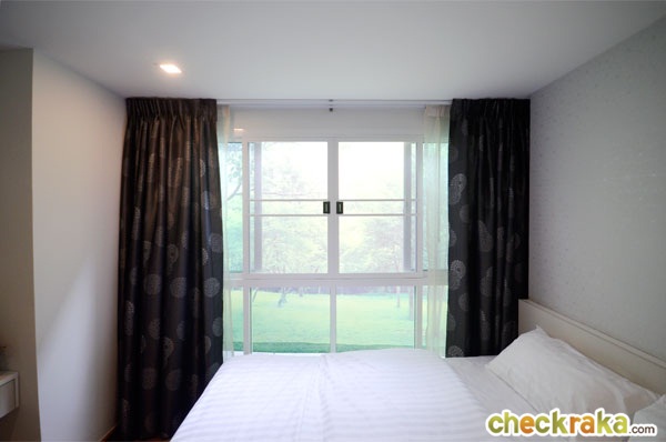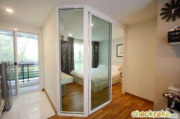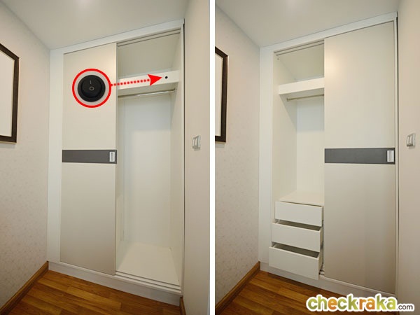 ในห้องนอนได้ตู้เสื้อผ้า Built-in ความสูงจรดเพดาน แบบบานเลื่อน 2 ตอน เปิดเลื่อนได้ทั้งทางซ้าย และทางขวา พร้อมปุ่มสวิตช์เปิด-ปิดไฟภายในตู้เสื้อผ้ามาให้ด้วย ปลายเตียงเหลือพื้นที่ค่อนข้างกว้างประมาณ 75 ซม. เดินได้สะดวก