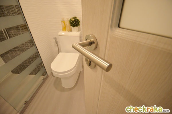 ย้ายไปดูห้องน้ำกับต่อค่ะ ห้องน้ำได้ประตูสำเร็จรูป ด้านหลังประตูติดตัวกันกระแทกไว้ให้