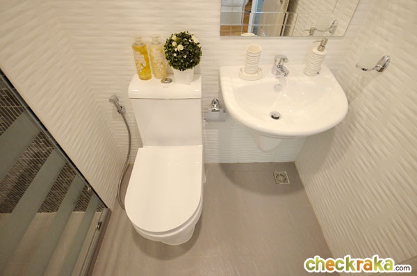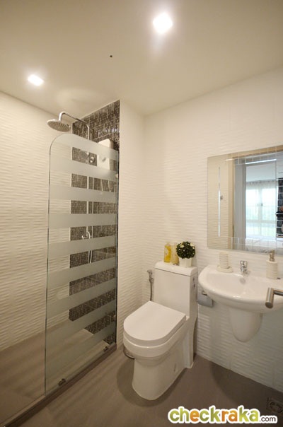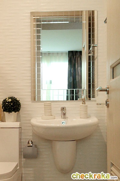 อ่างล้างหน้าก็เป็นของ Marvel เช่นกัน ใต้อ่างไม่มีตู้เก็บของ ส่วนกระจกเงาก็ได้ขนาดและแบบตามนี้ แบ่งพื้นที่ส่วนแห้งส่วนเปียกให้เรียบร้อย ทางโครงการติดฉากกั้นอาบน้ำบานเดี่ยวแบบติดตายมาให้ แต่ถ้าจะให้ดีแนะนำให้ติดเป็นแบบเต็มบาน หรือแบบบานเลื่อนจะช่วยป้องกันการกระเด็นของน้ำได้ดีกว่า