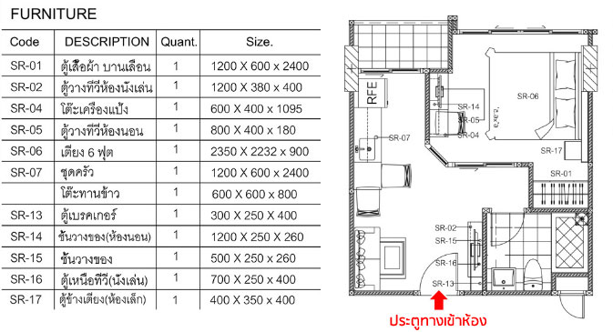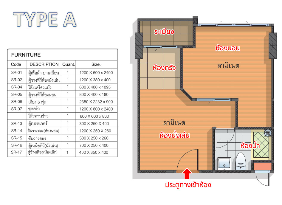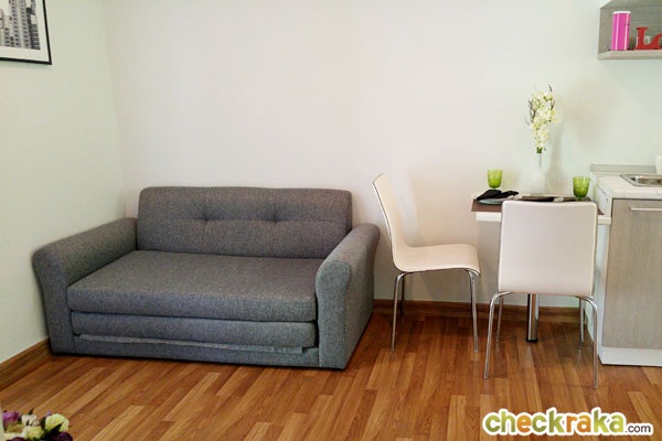 ห้องแบบ 1 ห้องนอน Type A พื้นที่ใช้สอย 28.45 - 29.41 ตร.ม. (คลิกเพื่อชมตัวอย่างแปลนห้องขนาดใหญ่) ห้องแบบ 1 ห้องนอน Type B พื้นที่ใช้สอย 37.69 ตร.ม.(คลิกเพื่อชมตัวอย่างแปลนห้องขนาดใหญ่) และห้องตัวอย่างที่จะพาไปชมกันนั้นเป็นห้องแบบ 1 ห้องนอน Type A ขนาดประมาณ 28.45 ตร.ม. โดย Layout ของห้องจะแบ่งพื้นที่ออกเป็น 4 ส่วนหลักๆ คือห้องนั่งเล่น ห้องครัว ห้องนอน และห้องน้ำ โดยห้องนอนมีพื้นที่ค่อนข้างใหญ่ทำให้ห้องดูกว้างสบาย และไม่รู้สึกอึดอัด ภายในห้องตัวอย่างตกแต่งเฟอร์นิเจอร์มาให้ครบแบบ Fully furnished ซึ่งสิ่งที่เห็นในห้องตัวอย่างนั้นลูกค้าจะได้ตามแบบนี้ทั้งหมดเลยค่ะ ยกเว้นเครื่องใช้ไฟฟ้า และของตกแต่งเท่านั้นที่จะไม่ได้ ตามเราไปดูห้องตัวอย่างกันค่ะ