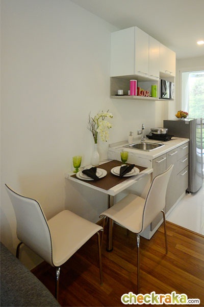 โต๊ะทานข้าวออกแบบมาให้เชื่อมต่อติดกับส่วนของเคาน์เตอร์ครัว ครัวที่ได้เป็นแบบครัวเปิด ไ