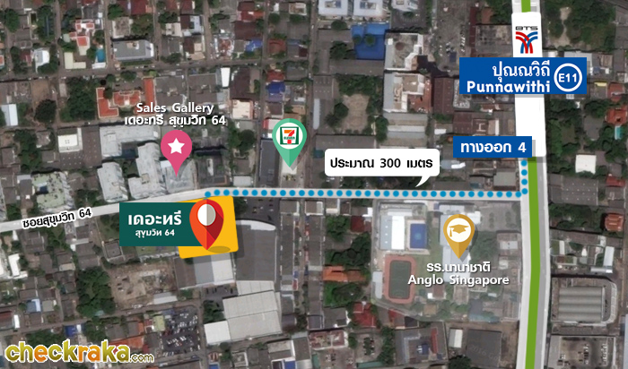ทางเดินจาก BTS สถานีปุณณวิถี มาโครงการเดอะทรี สุขุมวิท 64 ประมาณ 300 เมตรค่ะ