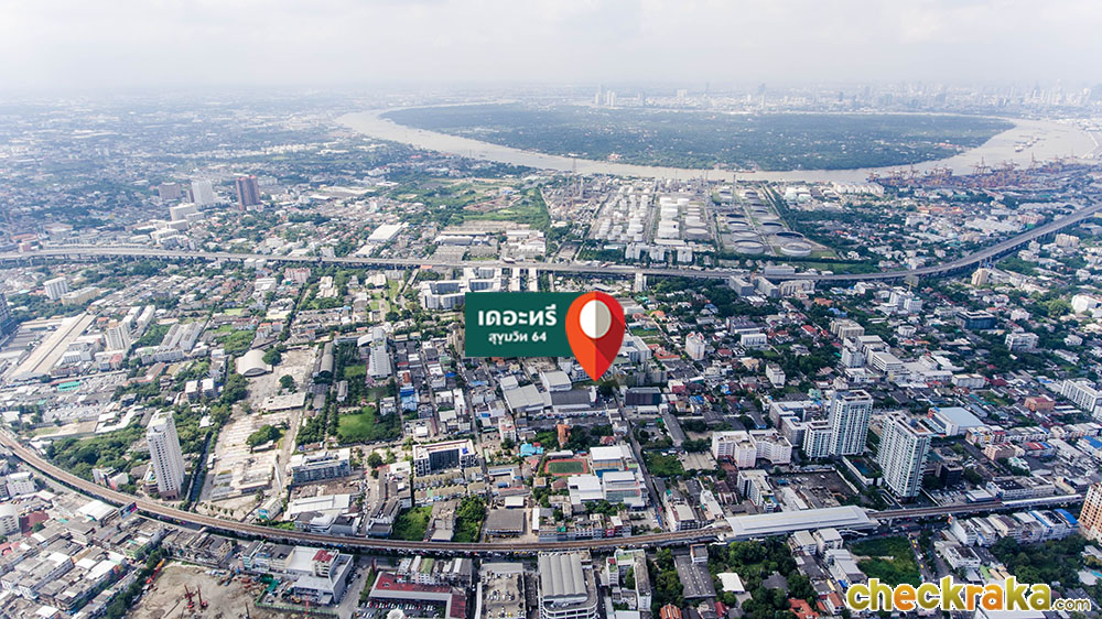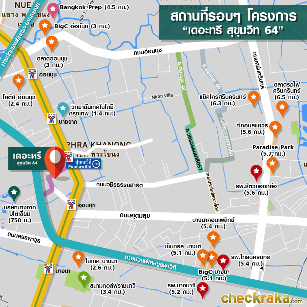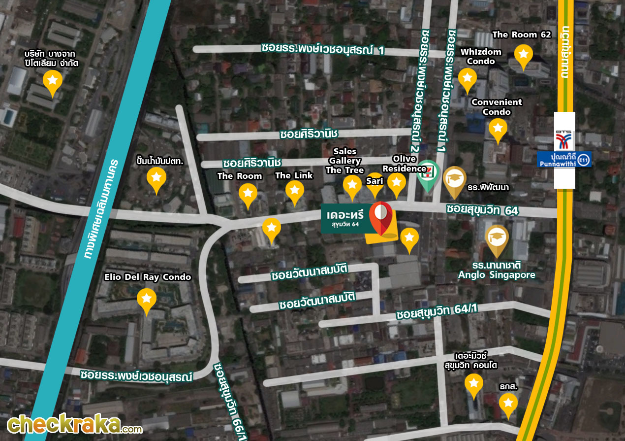 "เดอะทรี สุขุมวิท 64" ตั้งอยู่บนทำเลที่เรียกว่าใจกลางสิ่งอำนวยความสะดวกรายล้อมเลยก็ว่าได้ค่ะ จากภาพจะเห็นว่า อยู่กึ่งกลางระหว่าง ถนนสุขุมวิท มีรถไฟฟ้า BTS สายสีเขียวทอดยาวพาดผ่าน อีกด้านก็เป็นทางด่วนเฉลิมมหานคร สำหรับชีวิตที่ต้องมีครอบครัว มีบุตรหลาน ก็คงไม่ลำบาก เพราะมีโรงเรียนนานาชาติ และโรงเรียนพิพัฒนาอยู่ปากซอยสุขุมวิท 64 เรียกว่า เดินมาโรงเรียนก็ยังได้ สภาพบรรยากาศรอบๆ โครงการส่วนใหญ่เป็นอาคารที่พักอาศัย และคอนโดมิเนียม ทางเดินเข้าซอยตอนกลางคืนก็จะมีไฟสว่างเกือบทั้งซอย เพราะคอนโดแต่ละแห่งก็เปิดไฟสว่าง เดอะทรี สุขุมวิท 64 จึงเป็นอีกหนึ่งตัวเลือกที่ดี สำหรับผู้ที่อยากจับจองคอนโดตามแนวรถไฟฟ้า