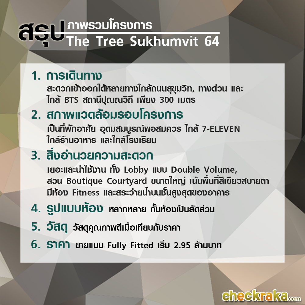 "The Tree สุขุมวิท 64" คอนโดมิเนียม Low-Rise โครงการใหม่จาก พฤกษา เรียลเอสเตท มีความเป็นส่วนตัวด้วยจำนวนยูนิตพักอาศัยเพียง 149 ยูนิตเท่านั้น พร้อมสวน Boutique Courtyard ก่อนหน้านี้แบรนด์ The Tree มักจะอยู่รอบๆ ชานเมือง แต่ครั้งนี้พฤกษายก The Tree เข้ามาตั้งอยู่ใจกลางเมืองสุขุมวิท ใกล้รถไฟฟ้า BTS สถานีปุณณวิถีเพียง 300 เมตรเท่านั้น เดี๋ยวเราตามไปชมบรรยากาศของโครงการนี้กันค่ะ