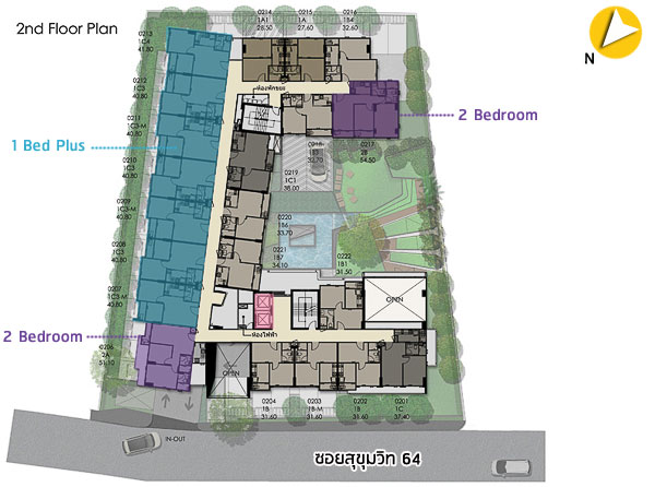 Floor Plan ชั้น 2 : เป็นส่วนพักอาศัย มียูนิตต่อชั้นอยู่ที่ 21 ยูนิต มีทั้งห้องแบบ 1 Bedroom, 1 Bed Plus และแบบ 2 Bedroom โดยชั้นนี้จะเสียพื้นที่จาก Double Space ของ Lobby
