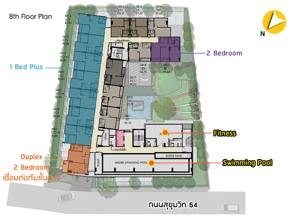 Floor Plan ชั้น 8 : ห้องพักอาศัยลดลงไปเหลือ 15 ยูนิต และมีห้อง Fitness เพิ่มขึ้นมาแทน ข้างๆ ห้อง Fitness ทำเป็นบันไดสำหรับเดินขึ้นไปยังชั้นดาดฟ้า และโซนด้านหน้าบริเวณใต้สระว่ายน้ำ ทางโครงการทำเป็น Double slap เพื่อเพิ่มความมั่นใจให้กับลูกบ้านว่าสระว่ายน้ำมีความแข็งแรง และไม่รั่วซึม