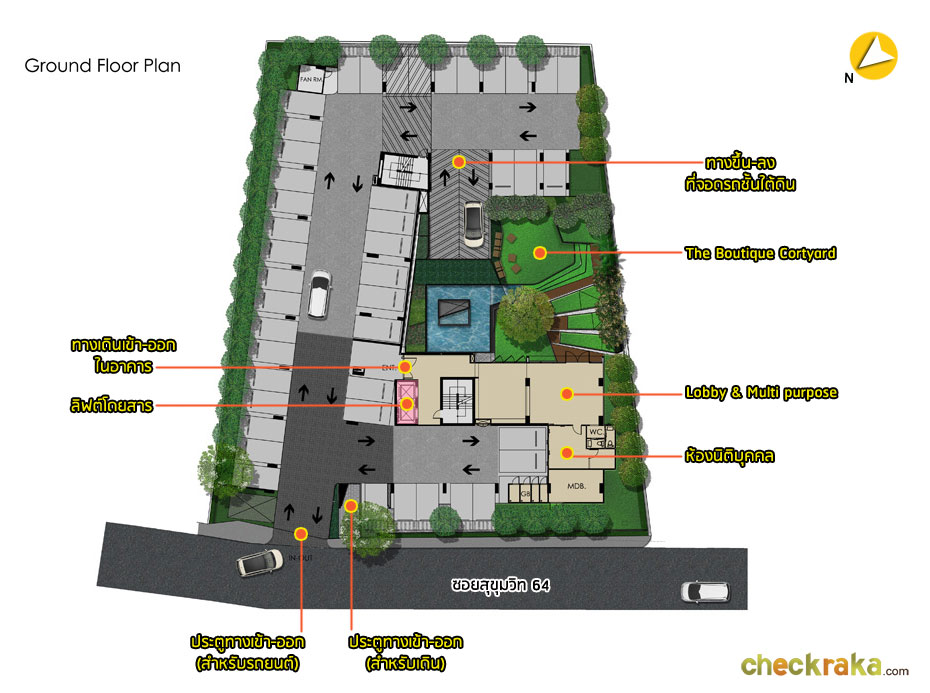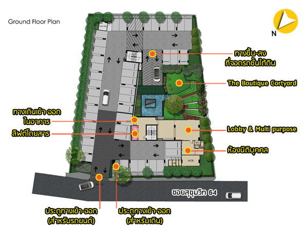 ตัวอาคารฝั่งทิศเหนือ : เป็นด้านหน้าโครงการติดกับซอยสุขุมวิท 64 ฝั่งตรงข้ามจะเป็น Siri Condo และอาคารสำนักงานสูง 3 ชั้น มีระยะห่างอยู่ที่ประมาณ 20 เมตร ตัวอาคารฝั่งทิศใต้ : เป็นด้านหลังของโครงการติดกับอาคารของ Hafele ที่มีความสูงถึง 5 ชั้น และอยู่ในระยะประชิด คงต้องเลือกชั้นสูงหน่อย เพื่อหลีกเลี่ยงวิวฝั่งนี้ ตัวอาคารฝั่งทิศตะวันออก : โซนด้านหน้าจะเป็นวิวที่จอดรถของ Hafele แต่ช่วงหลังจะติดกับ Hafele เป็นอาคารสูง 3 ชั้น ซึ่งห้องที่อยู่ชั้นล่างๆ อาจจะโดนบังวิวแบบเลี่ยงไม่ได้ ตัวอาคารฝั่งทิศตะวันตก : ห้องฝั่งที่บริเวณกลางๆ จะใกล้กลับอาคารสูง 4 ชั้น ส่วนโซนอื่นๆ มองไปเห็นเป็นคอนโด The Link Vano 64 แต่ก็ไม่ได้อยู่ในระยะประชิด Master Plan ชั้น 1 : ประกอบด้วย ประตูสำหรับเดินเข้าออก และประตูสำหรับรถยนต์ ที่ติดกับซอยสุขุมวิท 64 ภายในโครงการเดินรถแบบ 2 ทางสวนกันได้ จอดรถได้ทั้งลานจอดรถใต้อาคาร และโดยรอบบริเวณชั้น 1 รวม 69 คัน มีลิฟต์โดยสารให้ 2 ตัว อัตราส่วนการใช้ลิฟต์เฉลี่ยอยู่ที่ 74.5 ยูนิตต่อลิฟต์ 1 ตัว ถัดไปเป็น Lobby & Multi purpose มีบางส่วนจัดเป็นโซนห้องสมุด และห้องจดหมายรวมอยู่ภายในด้วย มองออกไปเป็นสวนหย่อม Boutique Courtyard อยู่ตรงกลาง พร้อมสระน้ำพุ