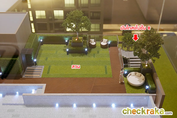 มีสวนหย่อม และพื้นที่นั่งเล่นอยู่ริมสระว่ายน้ำ จะเห็นว่าด้านข้างมีบันไดสำหรับเดินขึ้น-ลงไปยังชั้น 8