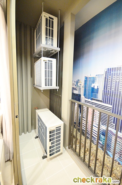 ระเบียงจะอยู่ติดกับห้องอเนกประสงค์ มีคอมเพรสเซอร์แอร์อยู่ทางซ้ายมือมีระแนงบังเพื่อความสวยงามเช่นเคย