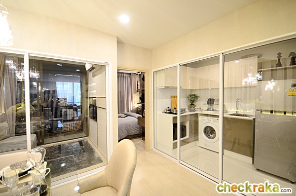 เข้ามาในห้องจะเจอกันห้องนั่งเล่นตั้งโซฟาอยู่ทางขวามือเชื่อมต่อกับห้องครัวแบบปิด มีโต๊ะทานอาหารตั้งอยู่ภายในครัว