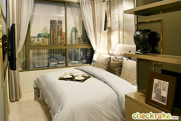 ภายในห้องนอนวางเตียงขนาด 6 ฟุต เหลือพื้นที่ทางเดินปลายเตียงประมาณ 65 ซม.