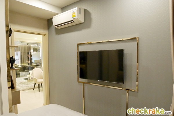 เข้ามาภายในห้องจะเจอกับชั้นวางทีวีอยู่ทางขวา มีระยะดูทีวีประมาณ 2.4 เมตร ตำแหน่งแอร์อยู่เหนือชั้นวางทีวี